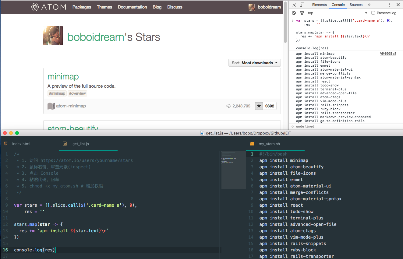 写了个小脚本,访问 atom.io 自己的 stars all 界面,在浏览器调试环境下执行,获得脚本需要文本,脚本如下: